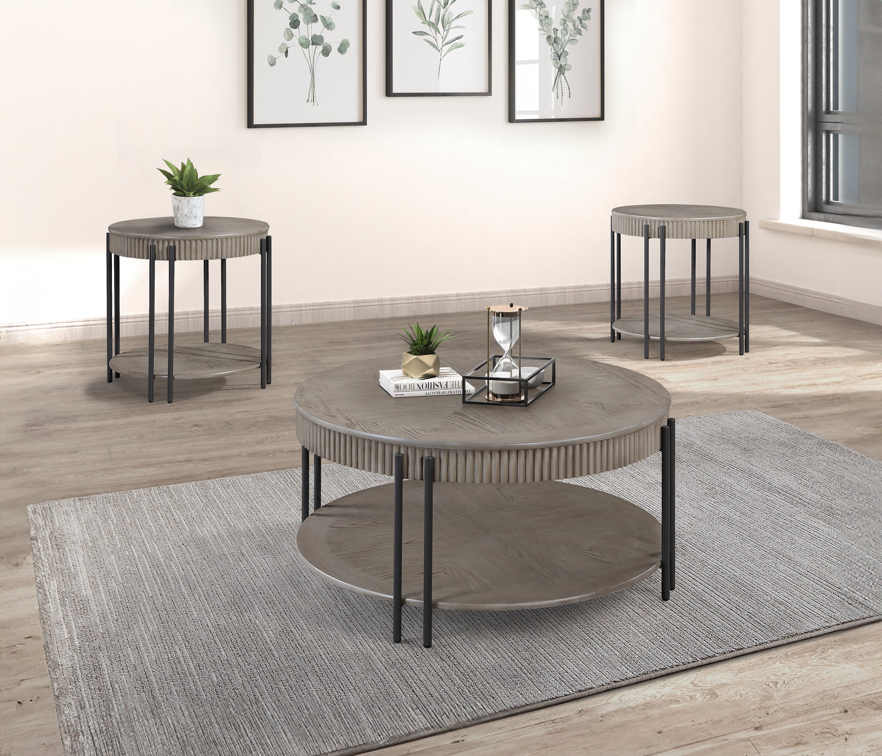 Elevate your living space with this contemporary cocktail table set, designed to blend seamlessly with modern and minimalist interiors. Each piece in the set features a sophisticated round tabletop with a subtle, textured finish that exudes understated elegance. The sleek black metal legs provide a striking contrast, offering both durability and a touch of industrial chic. The integrated lower shelves offer additional storage or display space, perfect for books, decorative items, or everyday essentials. With its clean lines and versatile design, this set promises to enhance your living room’s ambiance, providing a stylish and functional focal point for any gathering or daily use.
